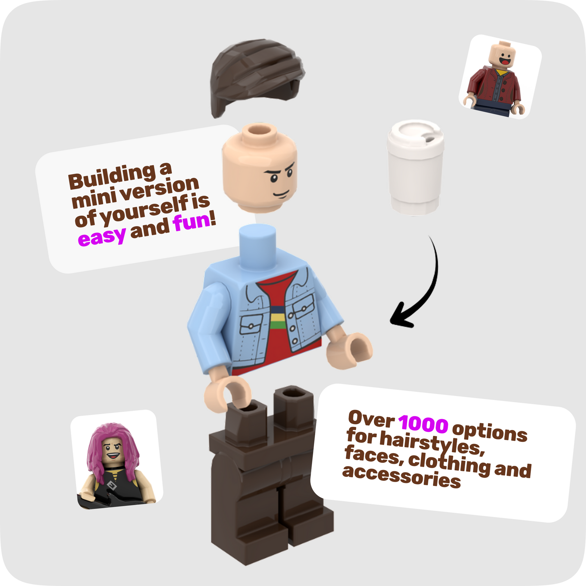 Over 1,000 combinations of faces, hairstyles, clothing, and accessories. Create a figure that looks like you or someone you love.