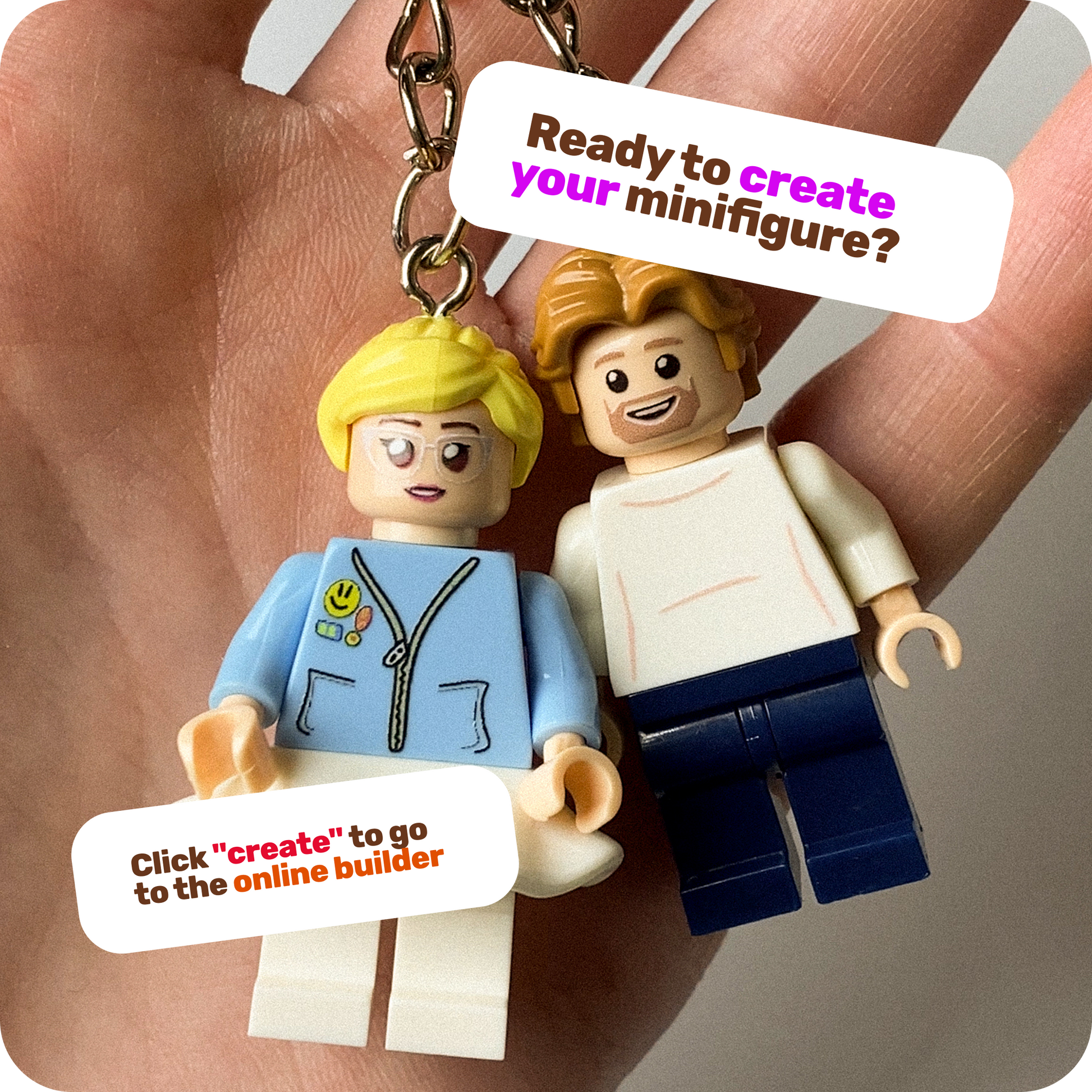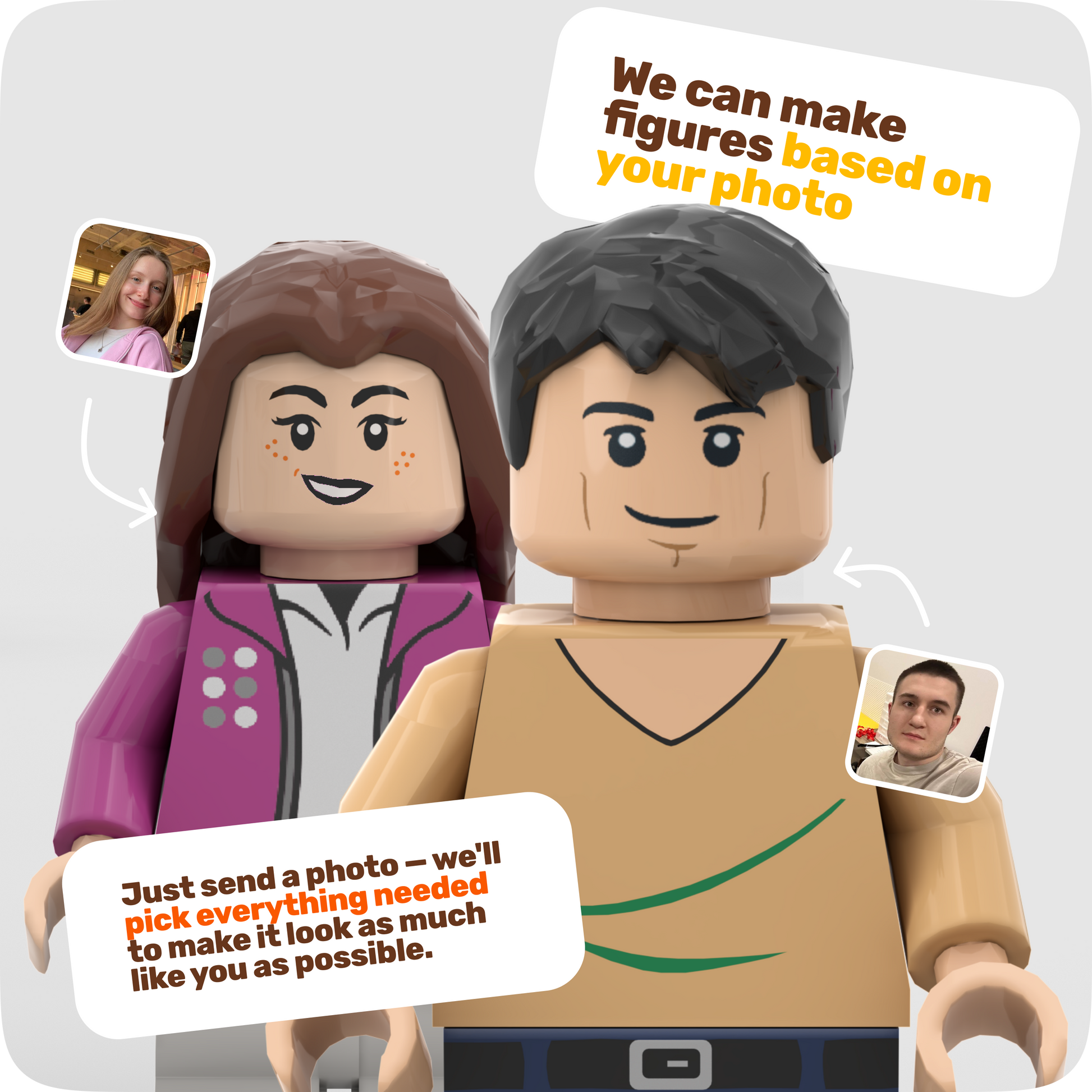 Click the "Create" button above — you'll go to our online configurator where you can choose all the parts: hairstyle, face, clothing, accessories and much more. The price depends on the parameters you choose and is shown in the top left corner of the configurator.Don't have time to create it yourself? Send your photos via any messenger (Instagram, email) — we'll create the figure for you. No extra charge! We respond very quickly.